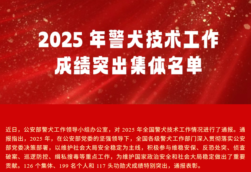 近日,公安部公布2025年全国警犬技术工作表彰名单,泗县公安局刑事技术暨警犬技术工作凭借扎实的队伍建设与突出的实战效能,荣获“2025年全国警犬技术工作成绩突出集体”称号。这份国家级荣誉,不仅是对全体训导员辛勤付出的最高肯定,更是对冲锋在前的“无言战友”的褒奖。