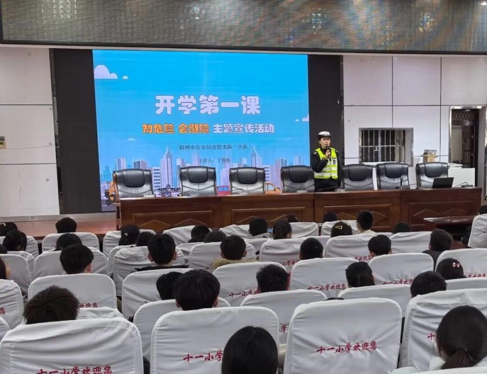 为切实增强中小学生交通安全意识与自我防护能力,护航青少年平安健康成长,新学期开学伊始,宿州交管一大队组织宣传警力走进辖区中小学校园,开展交通安全“开学第一课”主题宣传活动,为学生送上一堂生动实用、内容充实的交通安全教育课。
