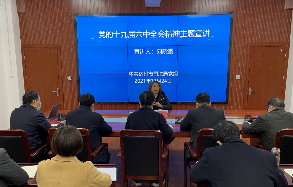 12月24日下午,宿州市司法局召开党的十九届六中全会精神主题宣讲会,党组书记、局长刘晓露带头对党的十九届六中全会精神进行宣讲,局机关全体党员干部参加了宣讲会。